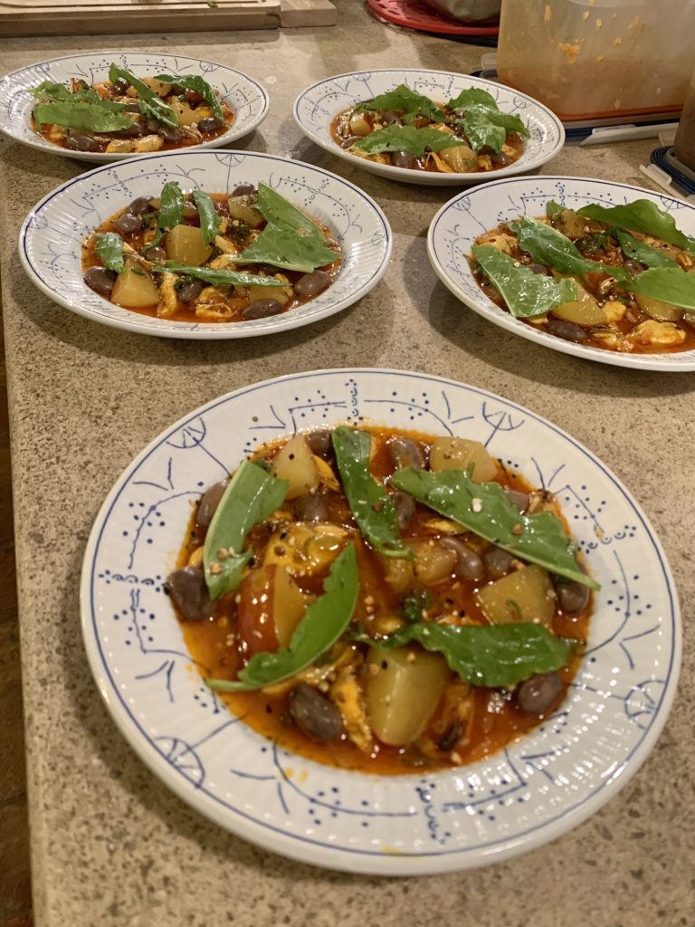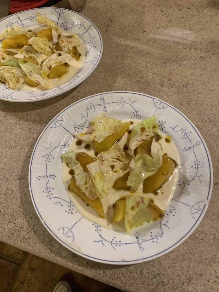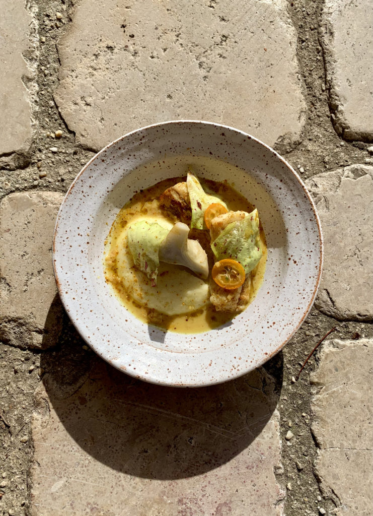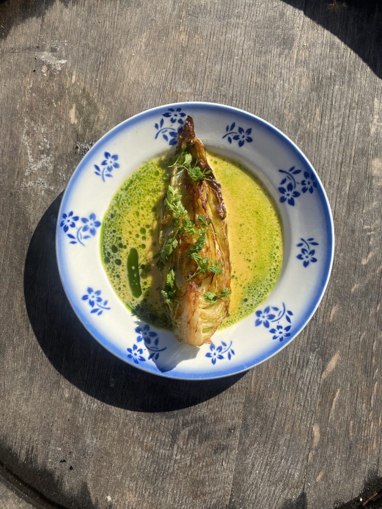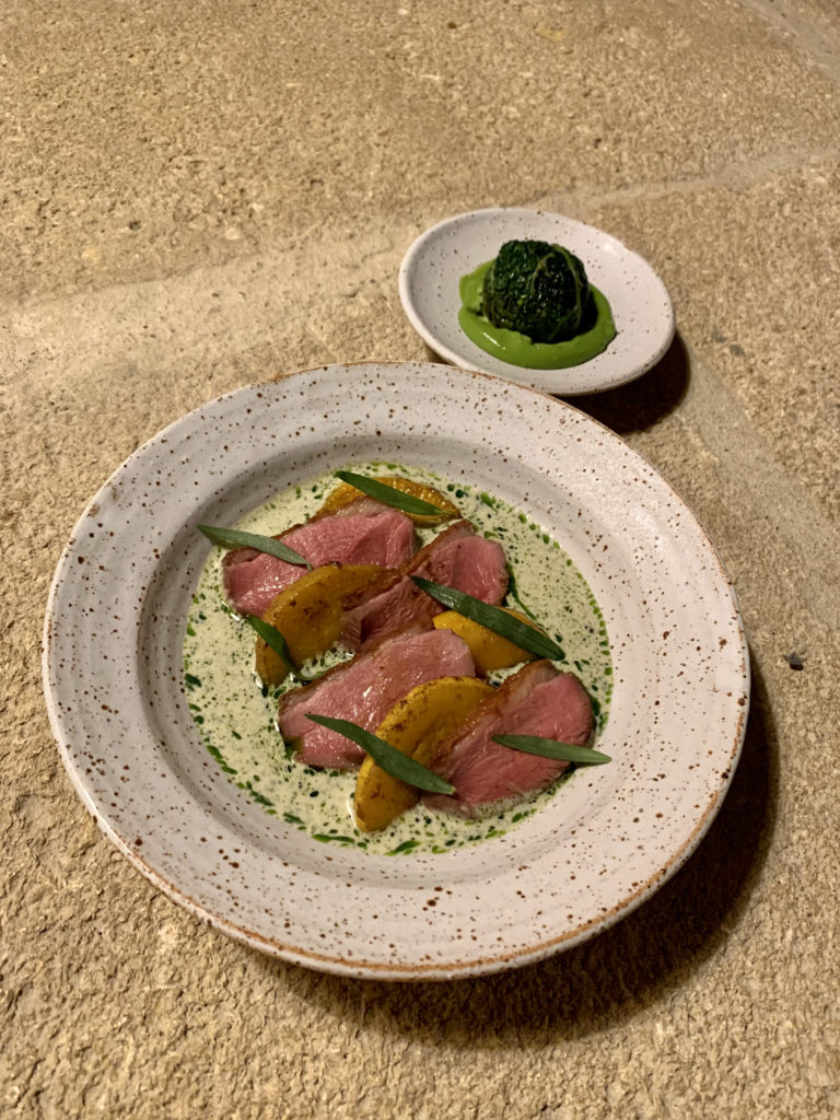 Salade tiède d’asperges / oeufs de truite / vinaigrette rhubarbe / oseille / cerfeuil Navet pôché / beurre de sauge / castel franco / sauce fonduta Chou pointu rôti / Beurre blanc aux agrumes Gnocchi Ricotta / suga de courge / noix de grenoble / beurre de sauge / pecorino romano Moules en escabèche / haricots borlotti/ nectarine /furikake / oseille Lotte / artichaut / mousseline de pomme de terre / beurre blanc badiane et macis Tarte aux asperges et noisettes Magret de canard / navet boule d’or / chou farçi / sauce au poivre vert / émulsion à l’estragon